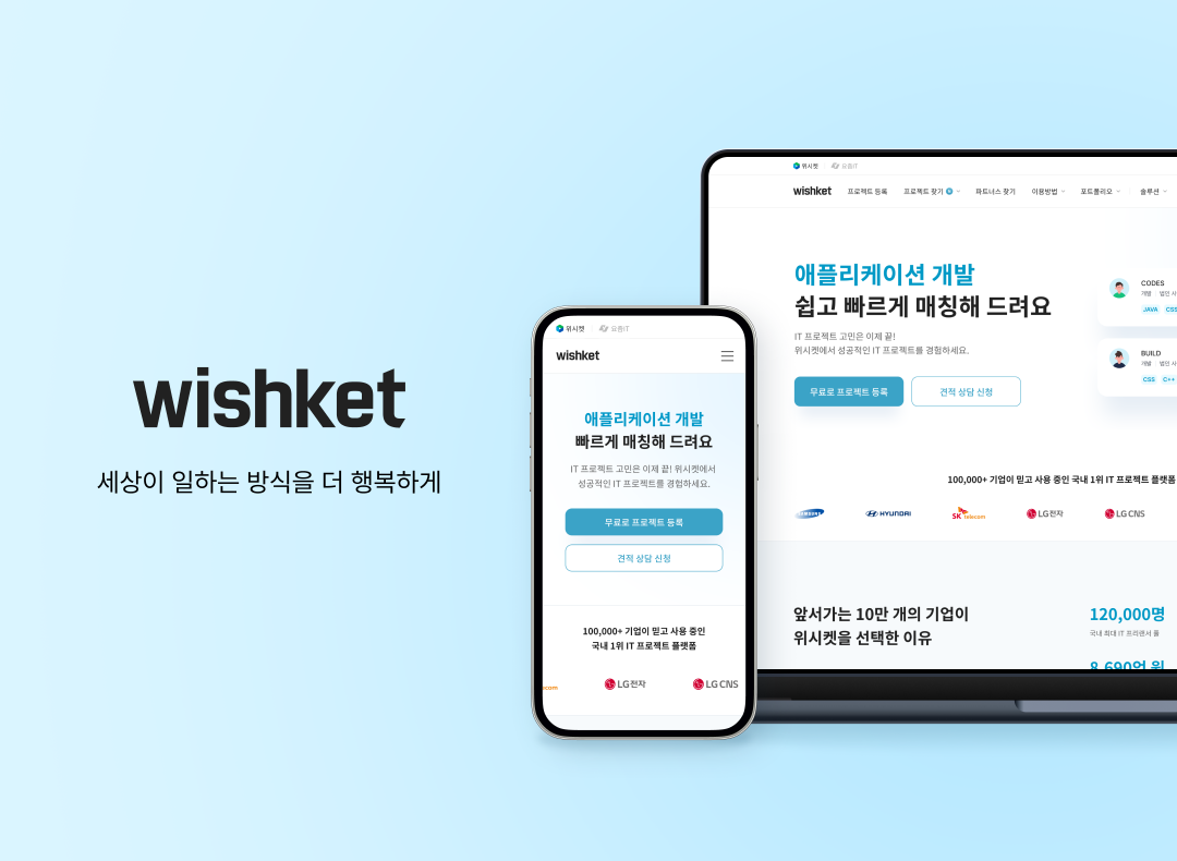위시켓에는 11만 명의 검증된 프리랜서와 1만 개의 개발회사가 여러분을 기다리고 있어요. 그냥 많은 것이 아니라, 클라이언트 리뷰, 레퍼런스 체크, 신원 인증을 통해 완전히 검증된 전문가들이에요.