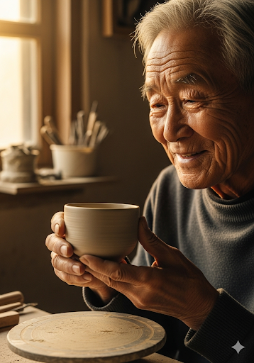 그는 갓 만든 도자기 찻잔을 조심스럽게 검사하고 있습니다.