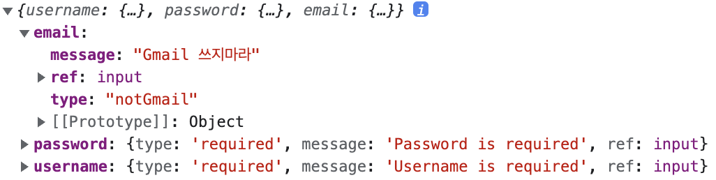 gmail을 거르는 validate를 만들었고 콘솔로 확인해보자
