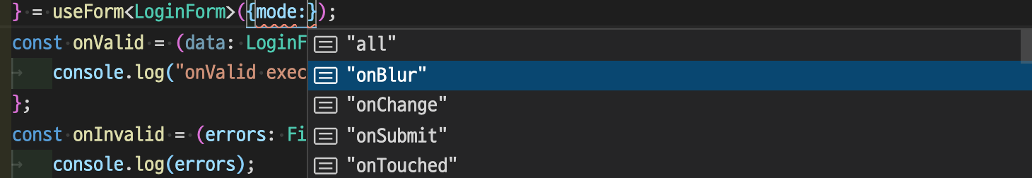 } = useForm<LoginForm>({ mode: "onChange" });