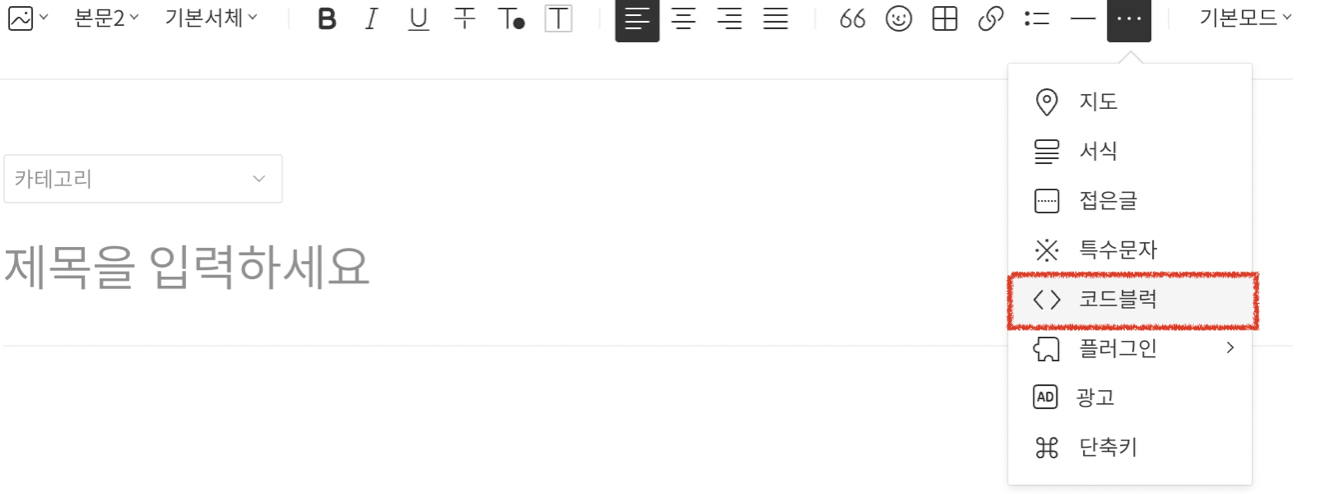 코드블럭 기능을 한번 찾아보았더니 어렵지 않게 찾을 수 있었다.